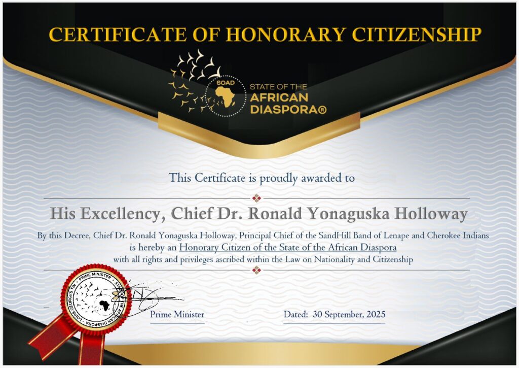 Le gouvernement de l’État de la diaspora africaine (SOAD) a, par décret de son Premier ministre, officiellement conféré la citoyenneté d’honneur à S.E. le chef Ronald Yonaguska Holloway, éminent dirigeant de la bande SandHill des Indiens Lenape et Cherokee (NY, NJ, PA) et actuel ministre des Affaires étrangères de la Fédération des nations autochtones des Amériques (FANA).